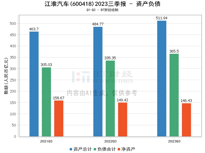 在资产负债方面,江淮汽车2023三季度,公司的总资产由上年度末的470.83亿元增长到本报告期末的511.94亿元,负债合计由上年度末的330.15亿元增长到本报告期末的365.5亿元,净资产由上年度末的140.67亿元增长到本报告期末的146.43亿元,资产负债率由上年度末的70.12%增长到本报告期末的71.4%。