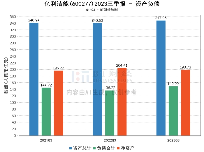 在资产负债方面,亿利洁能2023年三季度的总资产为347.96亿元,相比上年度末的350.73亿元有所下降。负债合计为149.22亿元,较上年度末的151.32亿元有所减少。公司的净资产为198.73亿元,略低于上年度末的199.41亿元。资产负债率为42.89%,较上年度末的43.14%有所降低。