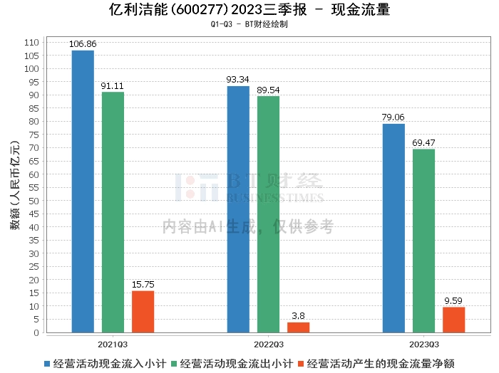 在现金流量方面,亿利洁能2023年三季度经营活动产生的现金流量净额为9.59亿元,较上年同期的3.8亿元有所增加。经营活动现金流入小计为79.06亿元,较上年同期的93.34亿元有所减少。经营活动现金流出小计为69.47亿元,较上年同期的89.54亿元有所减少。主要是本期支付税费及往来款项减少所致。