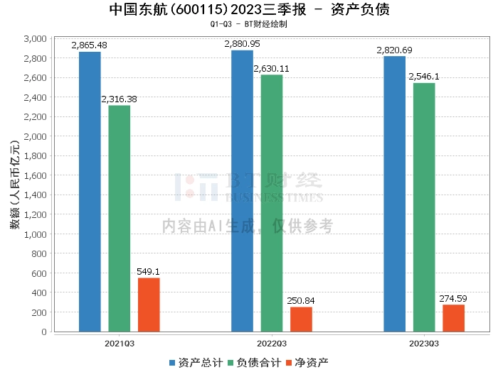 在资产负债方面,东航2023年三季度末的总资产为2820.69亿元,相比上年度末的2857.42亿元有所减少。负债合计为2546.1亿元,较上年度末的2556.41亿元略有下降。净资产为274.59亿元,相比上年度末的301.01亿元有所减少。资产负债率为90.27%,较上年度末的89.47%有所上升。