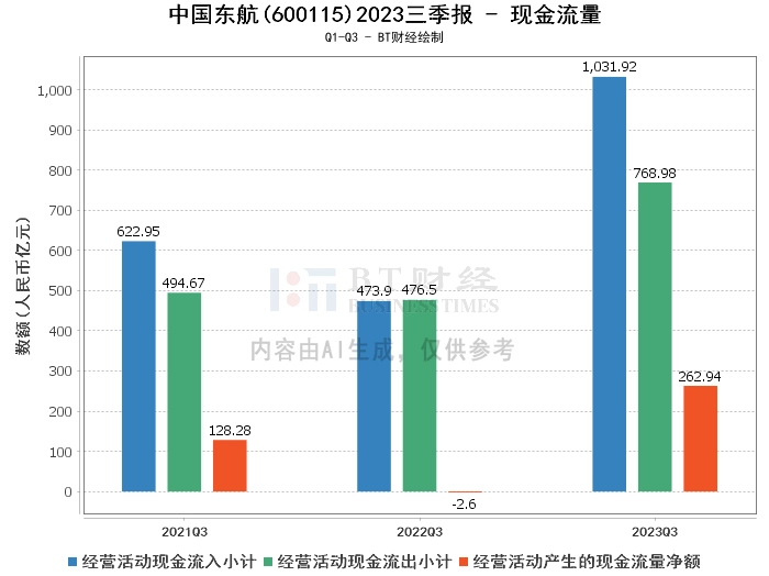 在现金流量方面,东航2023年三季度经营活动产生的现金流量净额为262.94亿元,较上年同期的-2.6亿元大幅提升。经营活动现金流入小计为1031.92亿元,较上年同期的473.9亿元有所增长。经营活动现金流出小计为768.98亿元,较上年同期的476.5亿元有所增加。