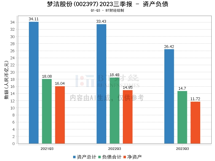 在资产负债方面,2023年三季度末,梦洁股份的总资产为26.42亿元,相比上年度末的27.7亿元有所下降。负债合计为14.7亿元,较上年度末的16.28亿元减少。公司的净资产为11.72亿元,较上年度末的11.42亿元有所增加。资产负债率为55.62%,较上年度末的58.76%有所下降。