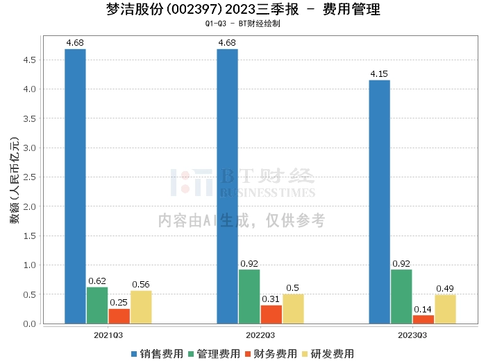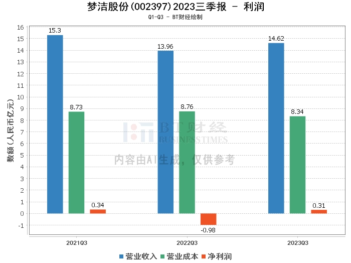 在利润方面,2023年三季度,梦洁股份的营业收入为14.62亿元,较上年同期的13.96亿元有所增长。营业利润为4247.4万元,较上年同期的-1.04亿元实现扭亏为盈。营业成本为8.34亿元,较上年同期的8.76亿元有所下降。净利润为3078.16万元,较上年同期的-9760.99万元实现扭亏为盈。