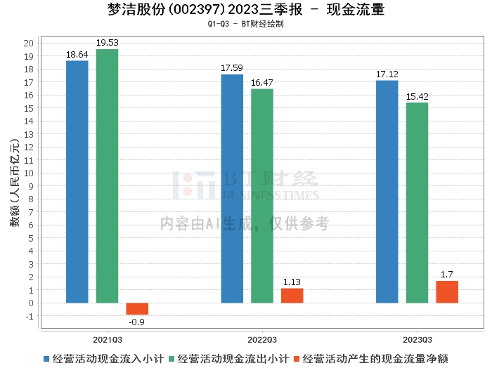 在现金流量方面,2023年三季度,梦洁股份的经营活动产生的现金流量净额为1.7亿元,较上年同期的1.13亿元有所增长。经营活动现金流入小计为17.12亿元,较上年同期的17.59亿元有所减少。经营活动现金流出小计为15.42亿元,较上年同期的16.47亿元有所减少。
