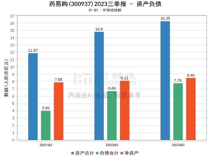 从资产负债方面来看,药易购2023年三季度的总资产为16.25亿元,较上年度末的15.92亿元有所增长。负债合计为7.76亿元,与上年度末的7.72亿元相比略有增加。净资产为8.49亿元,较上年度末的8.2亿元有所提升。资产负债率为47.74%,较上年度末的48.48%有所下降。