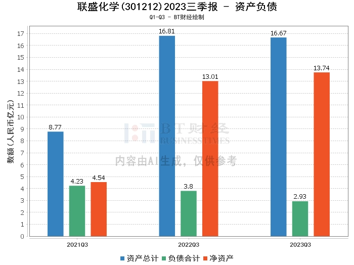 在资产负债方面,联盛化学2023年三季度的总资产为16.67亿元,较上年度末的16.49亿元略有增长。负债合计为2.93亿元,相较于上年度末的3.04亿元有所减少。净资产达到13.74亿元,较上年度末的13.45亿元有所提升。资产负债率为17.57%,较上年度末的18.41%有所下降。