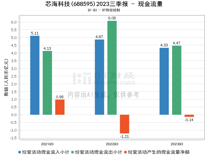 在现金流量方面,芯海科技2023年三季度的经营活动现金流入小计为4.33亿元,较上年同期的4.87亿元有所减少。经营活动现金流出小计为4.47亿元,较上年同期的6.08亿元有所减少。