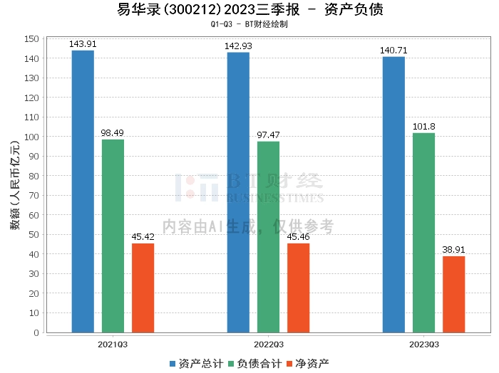 在资产负债方面,易华录2023年三季报显示,本报告期末的总资产为140.71亿元,相比上年度末的144.39亿元有所下降。负债合计本报告期末为101.8亿元,相比上年度末的100.19亿元有所增加。净资产本报告期末为38.91亿元,相比上年度末的44.2亿元有所减少。资产负债率本报告期末为72.35%,相比上年度末的69.39%有所增加。