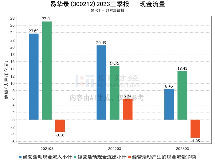 在现金流量方面,易华录2023年三季报显示,年初至本报告期末的经营活动产生的现金流量净额为-4.95亿元,相比上年同期的5.74亿元,现金流量净额大幅下滑。经营活动现金流入小计年初至本报告期末为8.46亿元,相比上年同期的20.49亿元有所减少。经营活动现金流出小计年初至本报告期末为13.41亿元,相比上年同期的14.75亿元有所减少。