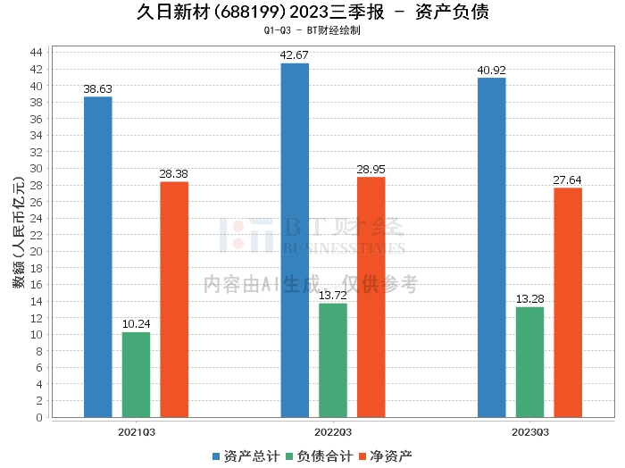 在资产负债方面,久日新材2023年三季度的总资产为40.92亿元,相比上年度末的41.06亿元略有下降。负债合计为13.28亿元,相比上年度末的12.79亿元有所增加。净资产为27.64亿元,相比上年度末的28.27亿元有所减少。资产负债率为32.46%,相比上年度末的31.16%有所上升。