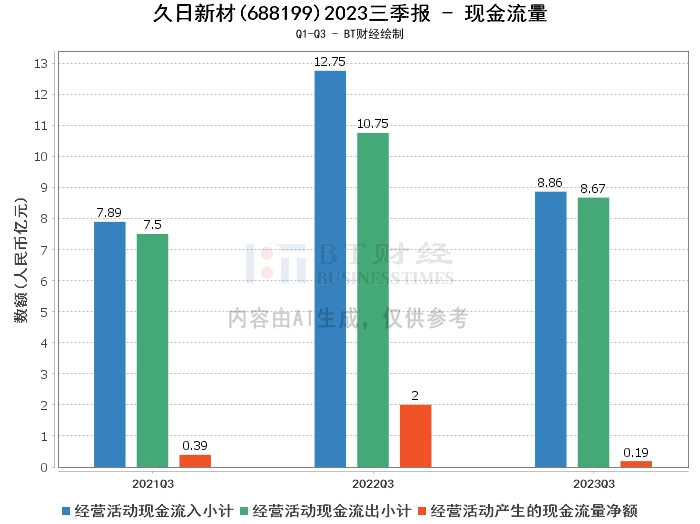 在现金流量方面,久日新材2023年三季度经营活动产生的现金流量净额为1935.79万元,相比上年同期的2亿元有所下降。经营活动现金流入小计为8.86亿元,相比上年同期的12.75亿元有所减少。经营活动现金流出小计为8.67亿元,相比上年同期的10.75亿元有所减少。
