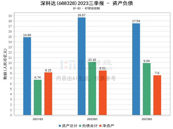在资产负债方面,深科达2023年三季度末的总资产为17.54亿元,较上年度末的18.07亿元有所下降。负债合计为9.94亿元,略低于上年度末的10.02亿元。净资产为7.6亿元,较上年度末的8.05亿元有所减少。资产负债率为56.66%,较上年度末的55.46%有所上升。