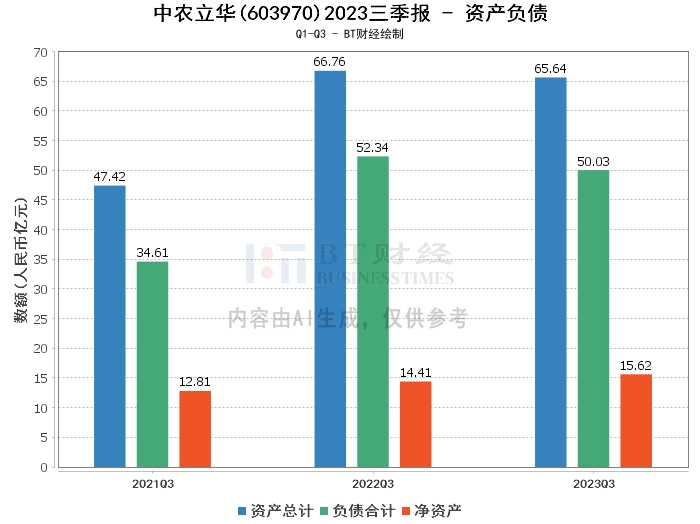 从资产负债方面看,中农立华2023年三季度末的总资产为65.64亿元,相比上年度末的62.46亿元有所增长。负债合计为50.03亿元,相比上年度末的47.62亿元也有所增加。净资产为15.62亿元,较上年度末的14.84亿元有所提升。资产负债率为76.21%,与上年度末的76.24%基本持平,显示出公司的财务结构稳定。