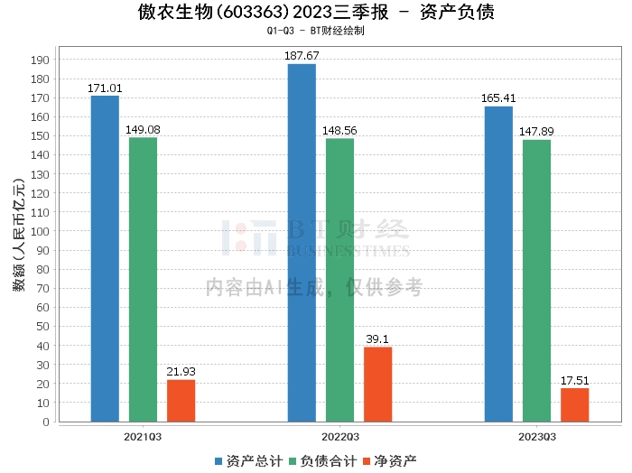 从资产负债方面来看,傲农生物2023年三季度的总资产为165.41亿元,相比上年度末的186.61亿元有所下降。负债合计为147.89亿元,相比上年度末的152.29亿元有所减少。公司的净资产为17.51亿元,相比上年度末的34.32亿元有所减少。资产负债率为89.41%,相比上年度末的81.61%有所上升。
