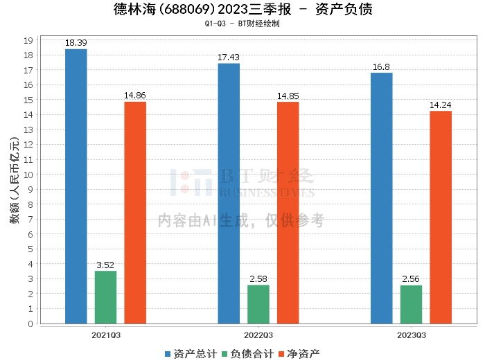 从资产负债方面来看,2023年三季度末,德林海的总资产为16.8亿元,相比上年度末的17.84亿元有所减少。负债合计为2.56亿元,较上年度末的3.05亿元有所下降。公司的净资产为14.24亿元,相比上年度末的14.79亿元也有所减少。资产负债率为15.23%,较上年度末的17.08%有所降低。