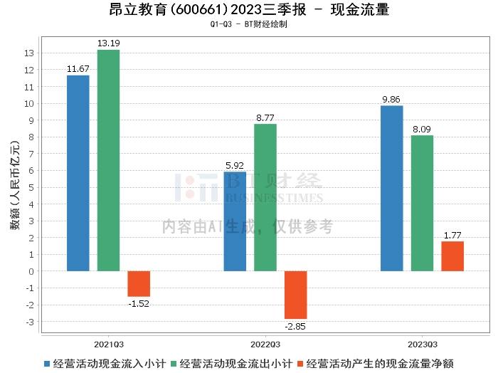综上所述,昂立教育2023年三季度的经营状况表现出一定的复杂性。营业收入的增长表明公司的业务规模在扩大,但同时营业利润和净利润的下降则反映出公司的盈利能力有所下降。在现金流量方面,经营活动产生的现金流量净额的改善则表明公司的现金流状况有所改善。
