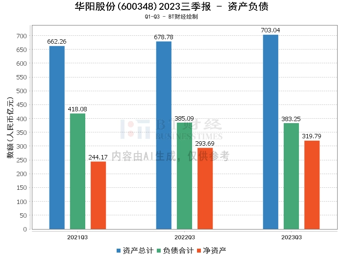 在资产负债方面,华阳股份2023年三季度的总资产为703.04亿元,相比上年度末的699.09亿元有所增长。负债总额为383.25亿元,相比上年度末的403.08亿元有所减少。净资产为319.79亿元,相比上年度末的296.01亿元有所增长。资产负债率为54.51%,相比上年度末的57.66%有所降低。
