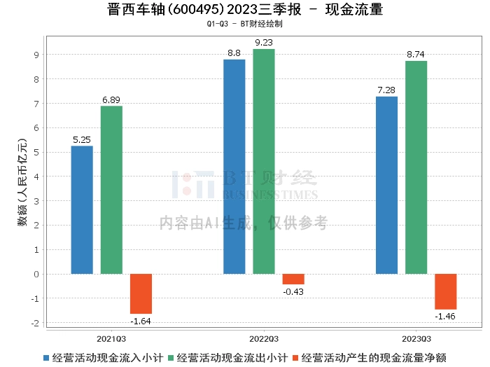 在现金流量方面,晋西车轴公司2023年前三季度的经营活动现金流入小计为7.28亿元,较上年同期的8.8亿元有所下降。经营活动现金流出小计为8.74亿元,较上年同期的9.23亿元有所下降。