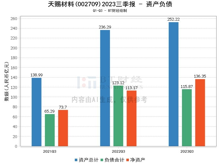 在资产负债方面,天赐材料2023年三季报显示,公司资产总计为252.22亿元,相比上年度末的255.31亿元有所下降。负债合计为115.87亿元,较上年度末的126.93亿元减少。净资产为136.35亿元,相比上年度末的128.38亿元有所增加。资产负债率为45.94%,较上年度末的49.72%有所下降。商誉为2.15亿元,大幅增长,主要原因为将东莞腾威纳入合并范围,合并成本大于可辨认净资产公允价值份额的差额计入商誉。