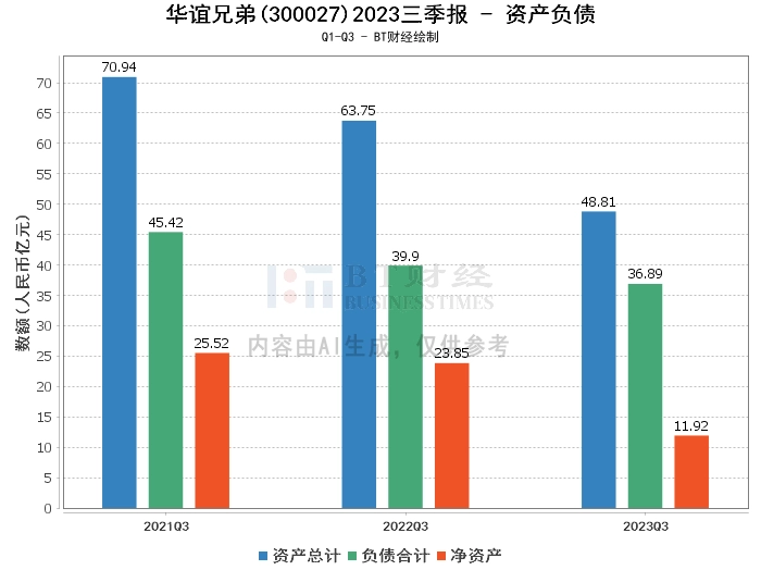 在资产负债方面,华谊兄弟2023年三季度的总资产为48.81亿元,相比上年度末的52.44亿元有所减少。负债合计为36.89亿元,相比上年度末的37.95亿元有所减少。公司的净资产为11.92亿元,相比上年度末的14.49亿元有所减少。资产负债率为75.57%,相比上年度末的72.37%有所上升。
