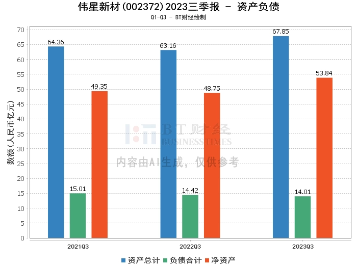 在资产负债方面,2023年三季度末,伟星新材的总资产为67.85亿元,相比上年度末的69.39亿元有所减少。负债合计为14.01亿元,较上年度末的14.88亿元有所下降。公司的净资产为53.84亿元,相比上年度末的54.5亿元略有减少。资产负债率为20.65%,较上年度末的21.45%有所降低。这些数据表明公司的负债水平在逐步降低,整体财务状况较为稳健。