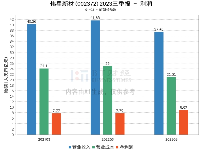 在利润方面,2023年三季度,伟星新材的营业收入为37.46亿元,相比上年同期的41.63亿元有所减少。营业利润为10.48亿元,较上年同期的9.22亿元有所增加。营业成本为21.01亿元,相比上年同期的25亿元有所下降。净利润为8.92亿元,较上年同期的7.79亿元有所增长。这些数据显示,尽管营业收入有所下滑,但公司的营业利润和净利润均实现了增长,显示出公司良好的盈利能力。