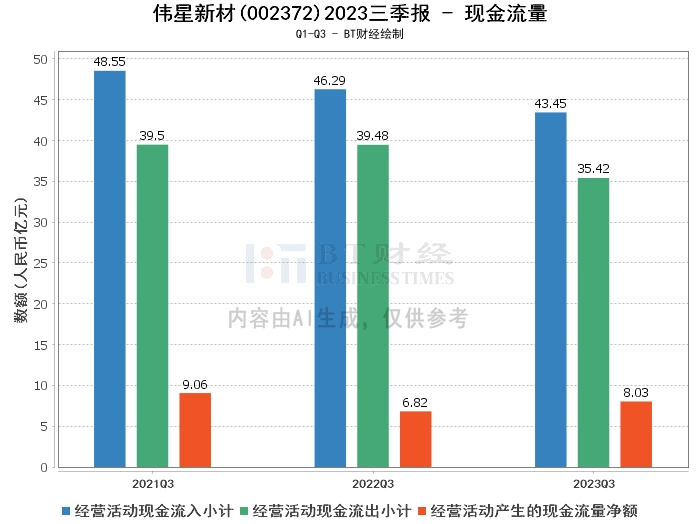 在现金流量方面,2023年三季度,伟星新材经营活动产生的现金流量净额为8.03亿元,较上年同期的6.82亿元有所增加。经营活动现金流入小计为43.45亿元,较上年同期的46.29亿元有所减少。经营活动现金流出小计为35.42亿元,较上年同期的39.48亿元有所减少。这些数据表明,尽管公司的经营活动现金流入有所减少,但经营活动产生的现金流量净额却实现了增长,显示出公司良好的现金流动性。