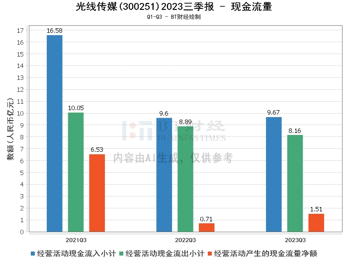 在现金流量方面,光线传媒2023年前三季度的经营活动产生的现金流量净额为1.51亿元,较上年同期的7137.81万元有所增长。经营活动现金流入小计为9.67亿元,与上年同期的9.6亿元相当。经营活动现金流出小计为8.16亿元,较上年同期的8.89亿元有所下降。