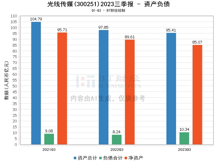 从资产负债方面来看,光线传媒2023年三季度末的总资产为95.41亿元,相较于上年度末的90.78亿元有所增长。负债合计为10.34亿元,较上年度末的8.13亿元有所上升。净资产为85.07亿元,较上年度末的82.65亿元有所增长。资产负债率为10.84%,较上年度末的8.96%有所上升。