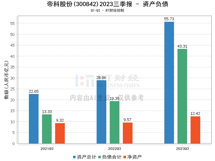 从资产负债方面来看,帝科股份2023年三季度的总资产为55.73亿元,相比上年度末的33.55亿元有所增长。负债合计为43.31亿元,相比上年度末的24.1亿元也有所增加。公司的净资产为12.42亿元,较上年度末的9.45亿元有所提升。资产负债率为77.71%,较上年度末的71.82%有所上升。