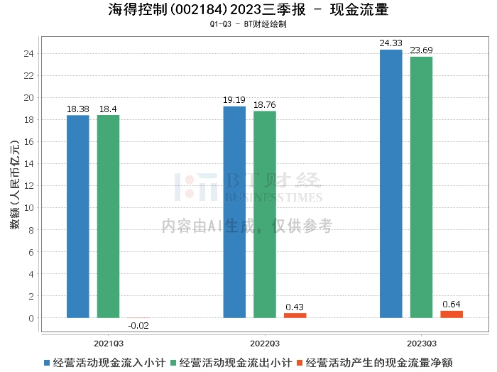 在现金流量方面,海得控制2023年三季度的经营活动产生的现金流量净额为6404.97万元,相比上年同期的4274.64万元有所增长。经营活动现金流入小计为24.33亿元,相比上年同期的19.19亿元有所增长。经营活动现金流出小计为23.69亿元,相比上年同期的18.76亿元也有所增长。