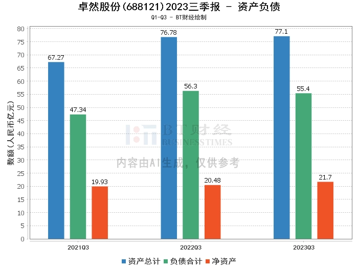 在资产负债方面,卓然股份2023年三季度的总资产为77.1亿元,相比上年度末的76.92亿元略有增长。负债合计为55.4亿元,也较上年度末的55.15亿元有所上升。净资产为21.7亿元,与上年度末的21.77亿元相比略有下降。资产负债率为71.86%,较上年度末的71.7%有所增加。