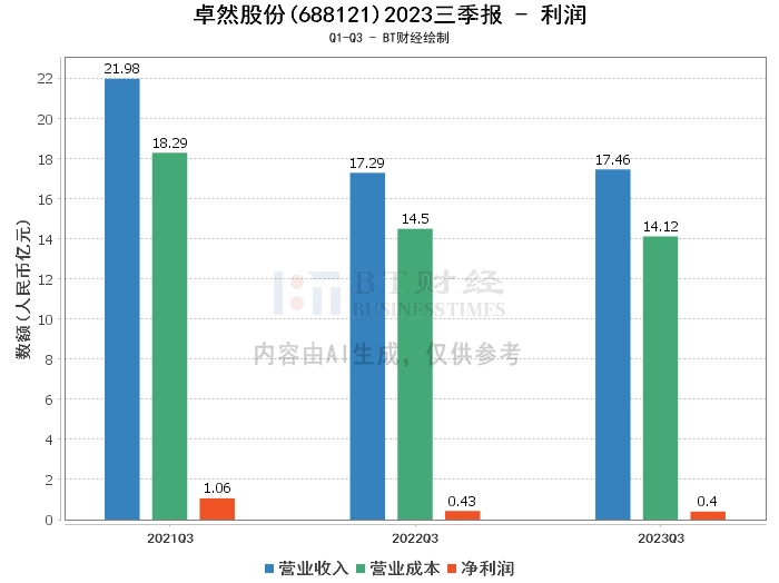 在利润方面,卓然股份2023年三季度的营业收入为17.46亿元,较上年同期的17.29亿元微增。营业利润为4689.62万元,较上年同期的6820.84万元有所下降。营业成本为14.12亿元,较上年同期的14.5亿元有所减少。净利润为3998.31万元,较上年同期的4314.5万元有所减少。