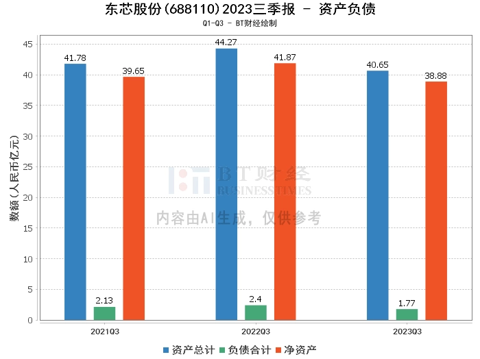 在资产负债方面,东芯股份2023年三季度报告期末的总资产为40.65亿元,相比上年度末的43.24亿元有所下降。负债合计为1.77亿元,较上年度末的2.07亿元有所减少。净资产为38.88亿元,相比上年度末的41.17亿元有所减少。资产负债率为4.36%,较上年度末的4.78%有所下降。