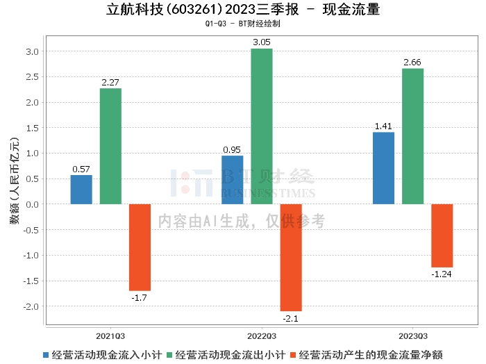 在现金流量方面,立航科技2023年三季度的经营活动现金流入小计为1.41亿元,较上年同期的9503.46万元有所增加。经营活动现金流出小计为2.66亿元,较上年同期的3.05亿元有所减少。这主要系收到的货款增加和购买材料支付的现金减少所致。