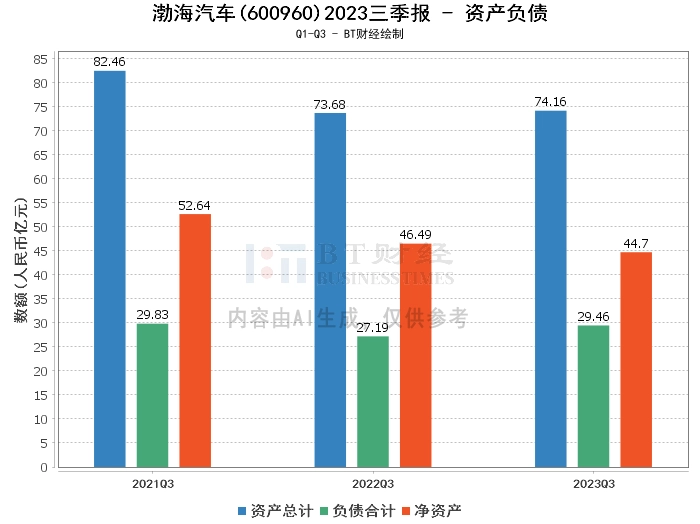 在资产负债方面,2023年三季度,渤海汽车的总资产为74.16亿元,相比上年度末的73.9亿元有所增长。负债合计为29.46亿元,较上年度末的27.86亿元有所增加。净资产为44.7亿元,较上年度末的46.04亿元有所下降。资产负债率为39.72%,较上年度末的37.7%有所上升。