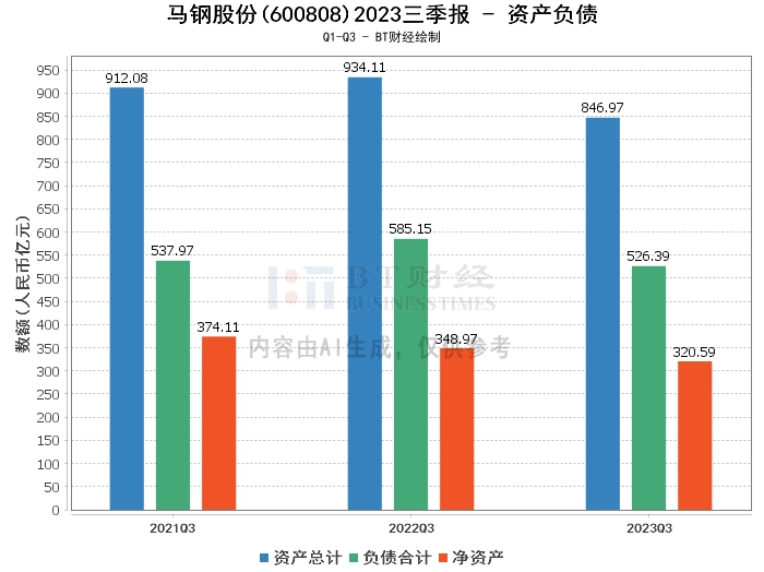 从资产负债方面来看,马钢股份2023年三季度的总资产为846.97亿元,相比上年度末的968.87亿元有所下降。负债合计为526.39亿元,较上年度末的635.61亿元有所减少。净资产为320.59亿元,较上年度末的333.26亿元稍有下降。资产负债率为62.15%,较上年度末的65.6%有所下降。净资产收益率(ROE)为-5.64%,较上年度末的1.87%有所下滑。