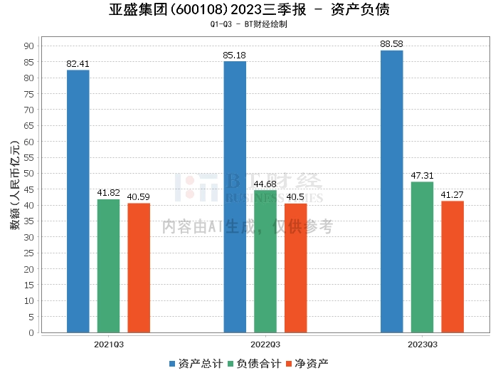 从资产负债方面看,亚盛集团2023年三季度末的总资产为88.58亿元,相比上年度末的87.33亿元有所增加。负债合计47.31亿元,上年度末为46.58亿元。净资产为41.27亿元,上年度末为40.75亿元。资产负债率为53.41%,略高于上年度末的53.34%。