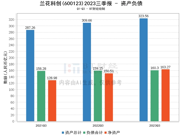 在资产负债方面,兰花科创2023年三季度末的总资产为323.56亿元,相比上年度末的303.42亿元增长了6.64%。负债合计为160.3亿元,相比上年度末的150.42亿元有所增长。净资产为163.27亿元,相比上年度末的153亿元增长了6.64%。资产负债率为49.54%,与上年度末的49.58%基本持平。