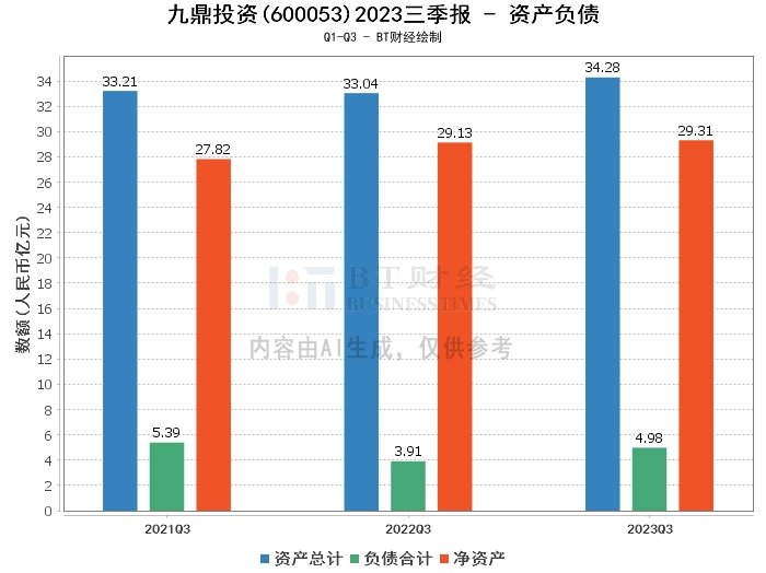 在资产负债方面,九鼎投资公司2023年三季度末的总资产为34.28亿元,相比上年度末的34.71亿元有所下降。负债合计为4.98亿元,略高于上年度末的4.94亿元。公司的净资产为29.31亿元,较上年度末的29.76亿元有所减少。资产负债率为14.52%,较上年度末的14.24%有所上升。