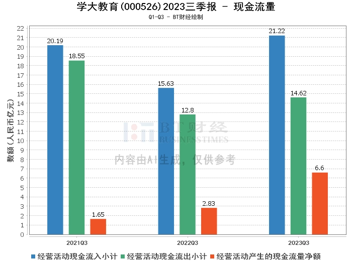在现金流量方面,学大教育2023年三季度的经营活动产生的现金流量净额为6.6亿元,较上年同期的2.83亿元有显著增长。经营活动现金流入小计为21.22亿元,较上年同期的15.63亿元有所增长。经营活动现金流出小计为14.62亿元,较上年同期的12.8亿元有所增加。