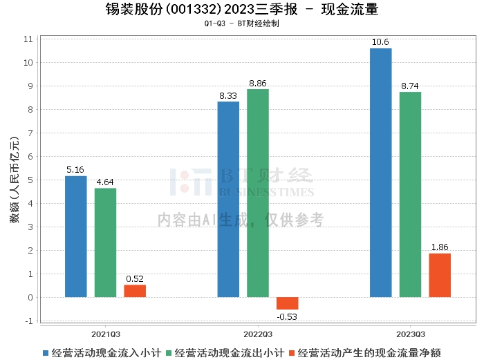 在现金流量方面,公司2023年三季度的经营活动产生的现金流量净额为1.86亿元,相比上年同期的-5319.22万元有显著增长。经营活动现金流入小计为10.6亿元,相比上年同期的8.33亿元增长了27.14%。经营活动现金流出小计为8.74亿元,相比上年同期的8.86亿元有所下降。