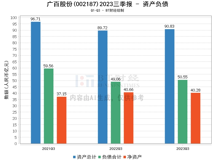 在资产负债方面,广百股份公司的总资产为90.83亿元,较上年度末的93.27亿元有所减少。负债合计为50.55亿元,较上年度末的53.36亿元有所减少。净资产为40.28亿元,较上年度末的39.92亿元有所增加。资产负债率为55.65%,较上年度末的57.2%有所下降。