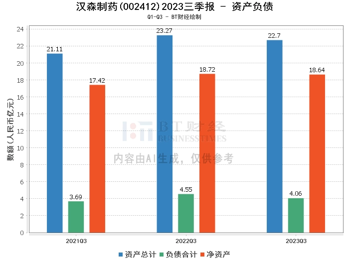 在资产负债方面,汉森制药2023年三季度的总资产为22.7亿元,相比上年度末的22.91亿元略有下降。负债总额为4.06亿元,比上年度末的3.97亿元有所增加。公司的净资产为18.64亿元,相比上年度末的18.94亿元有所减少。资产负债率为17.87%,较上年度末的17.32%略有提高。