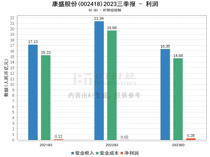 康盛股份(股票代码:002418)是一家总部位于浙江省杭州市淳安县的上市公司,业务领域涵盖家电制冷管路及配件和新能源商用车两大核心业务板块。在2023年三季度,公司实现了稳定的营业收入和净利润,尽管家电制冷管路及配件业务板块的营业收入有所下降,但公司通过优化产品结构和加强研发创新取得了一定增量。