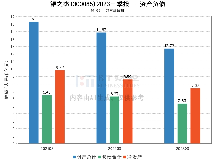 在资产负债方面,银之杰2023年三季度的总资产为12.72亿元,相较于上年度末的12.89亿元有所下降。负债合计为5.35亿元,相较于上年度末的5.12亿元有所上升。净资产为7.37亿元,相较于上年度末的7.77亿元有所下降。资产负债率为42.07%,相较于上年度末的39.72%有所上升。