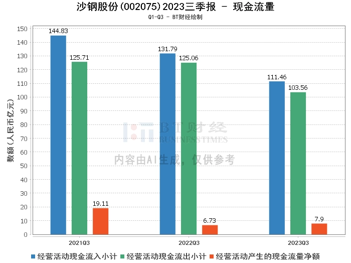 在现金流量方面,沙钢股份2023年三季度的经营活动产生的现金流量净额为7.9亿元,相较于上年同期的6.73亿元,增长了17.34%。经营活动现金流入小计为111.46亿元,相较于上年同期的131.79亿元有所减少。经营活动现金流出小计为103.56亿元,相较于上年同期的125.06亿元有所减少。