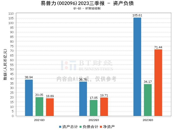 在资产负债方面,易普力2023年三季度的总资产达到105.61亿元,相比上年度末的46.46亿元增长了127.31%。负债总额为34.17亿元,相比上年度末的21.37亿元增长了59.91%。公司的净资产为71.44亿元,相比上年度末的25.09亿元增长了184.67%。资产负债率为32.36%,相比上年度末的46%下降了13.64个百分点。