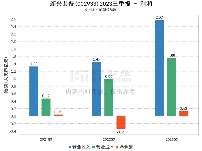 在利润方面,新兴装备2023年三季度的营业收入为2.57亿元,较上年同期的1.45亿元有显著增长。营业利润为1154.48万元,相比上年同期的-3588.08万元实现了扭亏为盈。营业成本为1.55亿元,较上年同期的9898.69万元有所增加。净利润为1293.26万元,较上年同期的-3438.81万元实现了扭亏为盈。
