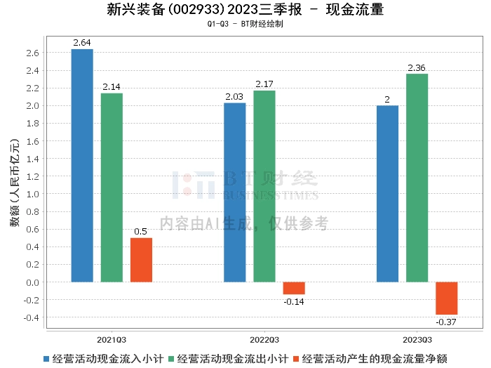 在现金流量方面,新兴装备2023年三季度的经营活动现金流入小计为2亿元,与上年同期的2.03亿元相当。经营活动现金流出小计为2.36亿元,较上年同期的2.17亿元有所增加。
